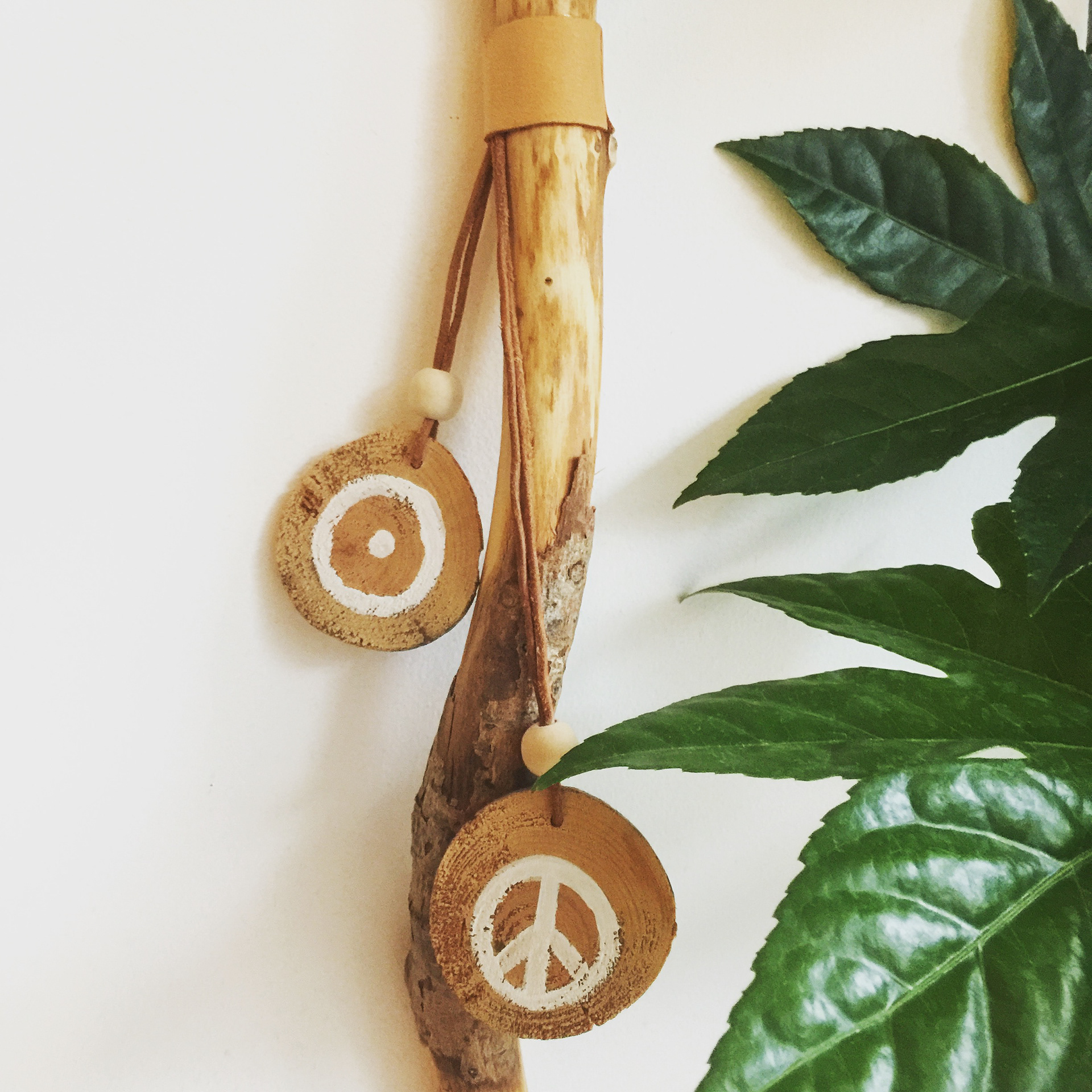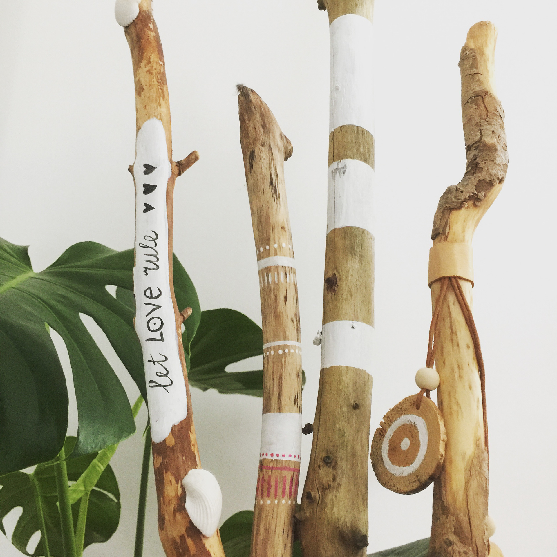 Joywave maakt Talking Sticks van takken uit de natuur én natuurlijke materialen als houten kralen, Tibetaanse munten, leer, draad, veertjes, verf en meer.