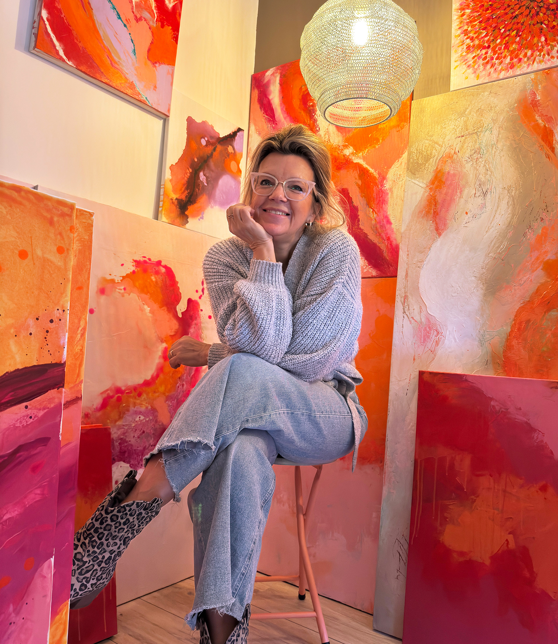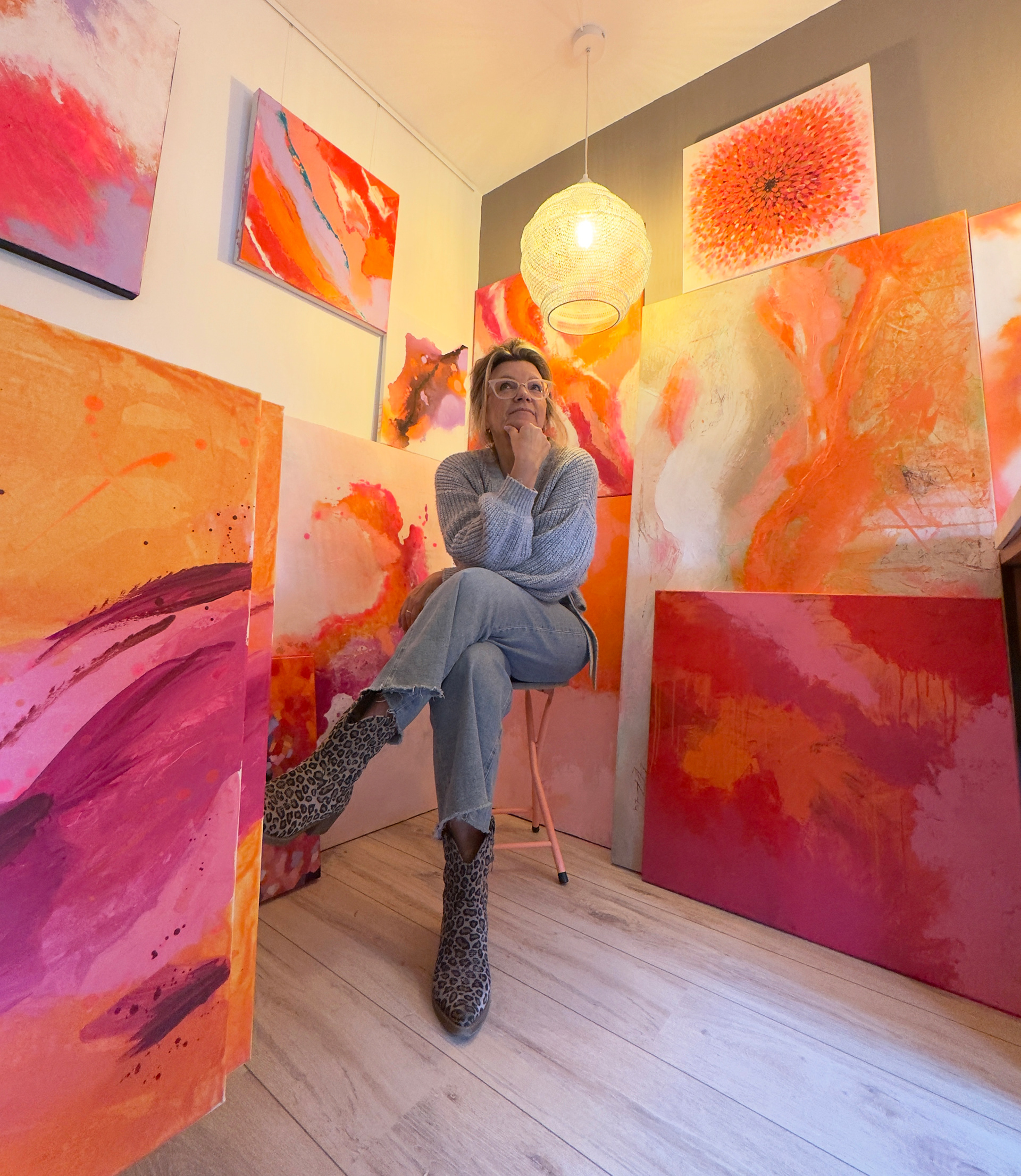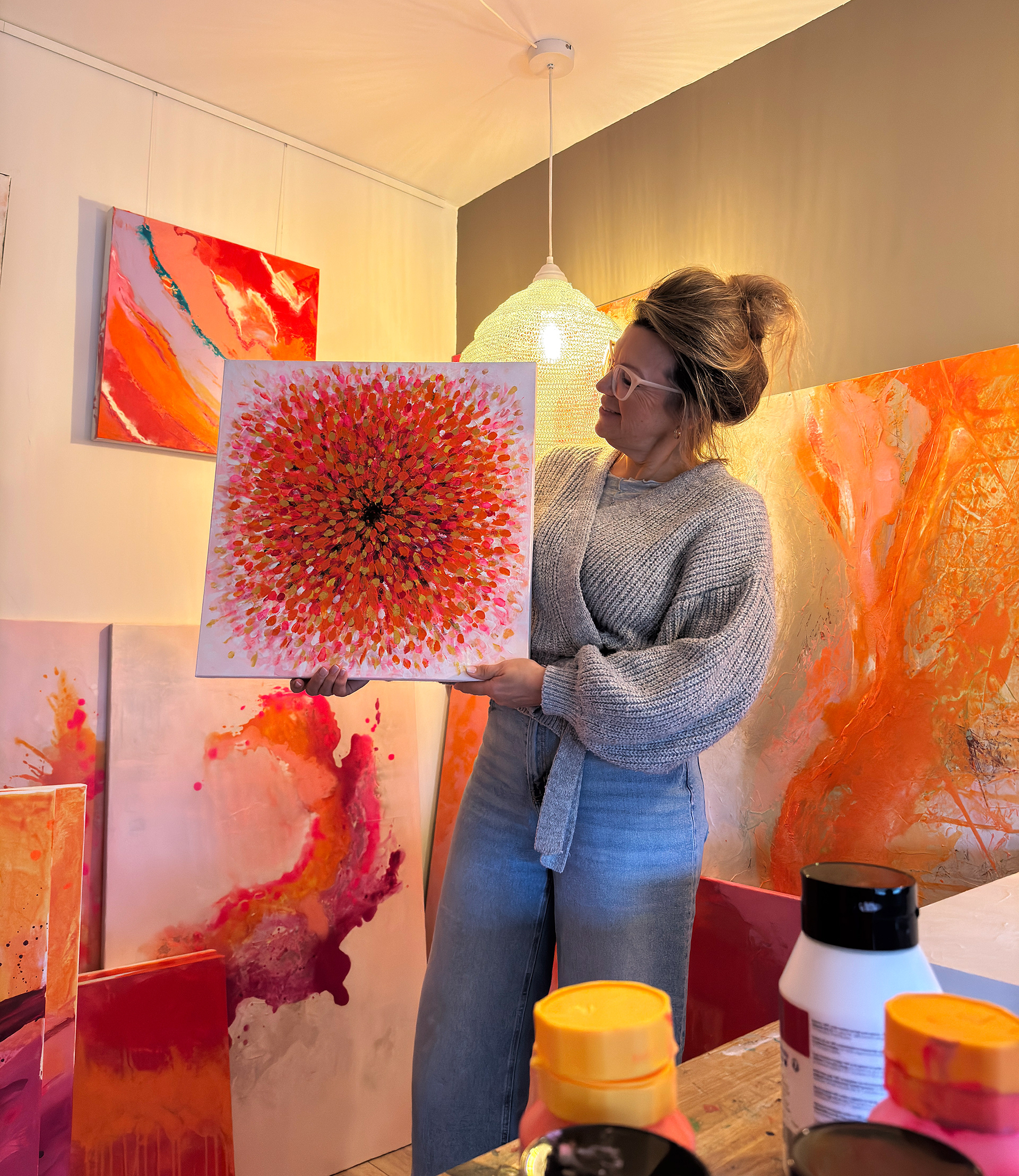 Ontwerpen en mooie dingen maken is mijn passie en in mijn werk als grafisch ontwerper kan ik veel kwijt, maar helemaal als ik schilder! Dan ben ik los van alles, vergeet ik de tijd en ga ik helemaal op in de verf en het doek. Ik schilder intuïtief en weet nooit van tevoren wat er gaat ontstaan. Ik begin met muziek of een korte meditatie zodat ik in mijn lijf zak. Daarna kies ik kleuren op gevoel en laat ik mijn handen het werk doen. Geen vaste stijl, geen kaders. Als het uit mijn hart komt, is het mijn stijl. Ik houd van sprekende kleuren als oranje, roze, zalm, paars, lila, gecombineerd met aardse tinten en neon als accent. Kleuren die leven en warmte en vrolijkheid uitstralen. Groen en blauw komen minder vaak vanzelf in mij op, dus die verschijnen maar zelden op het doek.